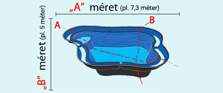 A méret kiszámításához egy közönséges zsineget vagy mérőszalagot fektessen végig a tó fenekén. Ezt ismételjük meg az ábrán látható módon, mindkét oldalon. („A” és „B” mérés, a mellékelt illusztráción). Ez lesz a valós mederméret, amire jön a ráhagyás: 2 x 0,5 m, amelyet tetszőlegesen el tud burkolni vagy takarni. Fontos, hogy a két legszélesebb ponton mérjen. Végül illessze be a kapott eredményt tófólia kalkulátorunkba!